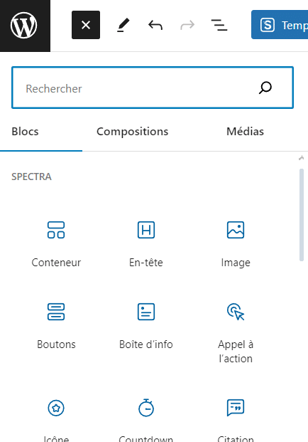 +(Ajouter un bloc) généralement situé en haut ou au sein de l’éditeur Gutenberg. - Parcourez ou recherchez le type de bloc que vous souhaitez ajouter (par exemple, texte, image, bouton).